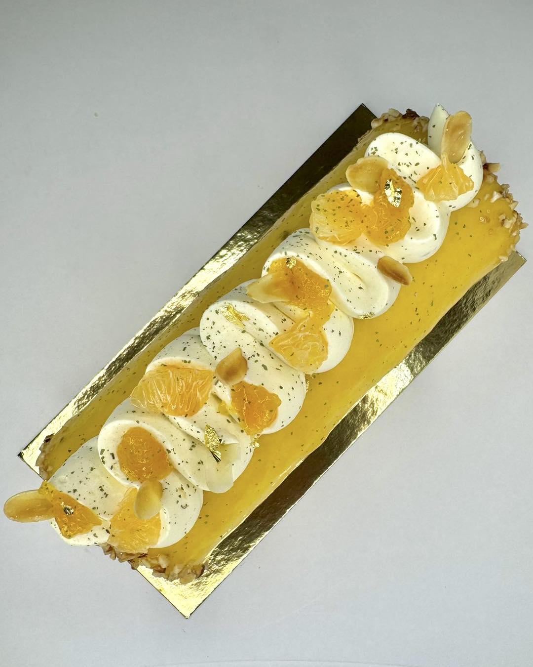 Cette pâtisserie associe la douceur d'une mousse onctueuse à la vivacité des agrumes. Son jeu de textures et de parfums en fait un dessert idéal pour conclure un repas de fête tout en légèreté.